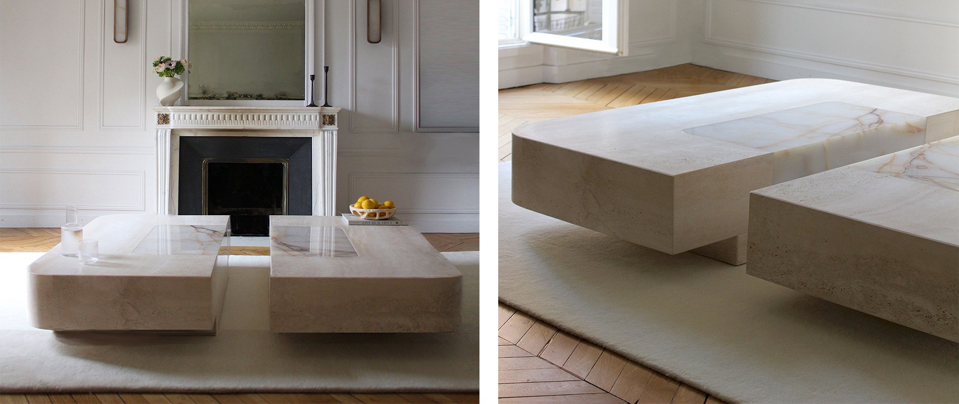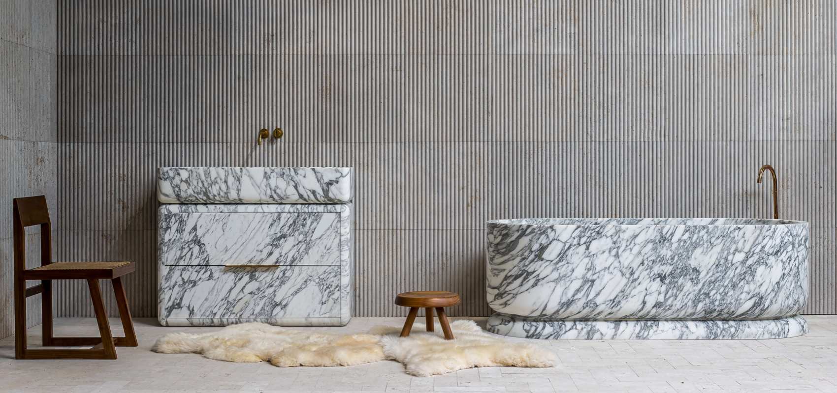 O mármore é integrado em cada espaço na forma de mobiliário para alcançar unidade de design.