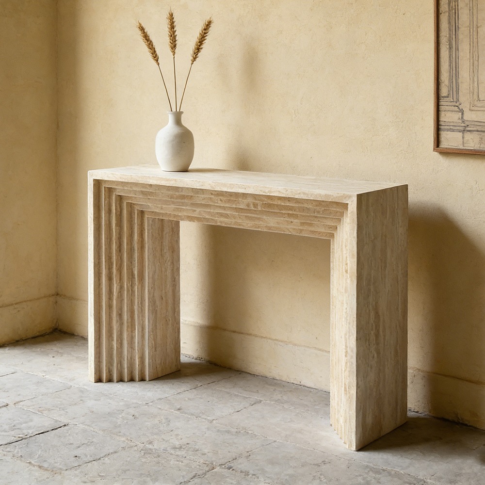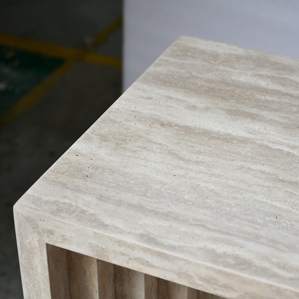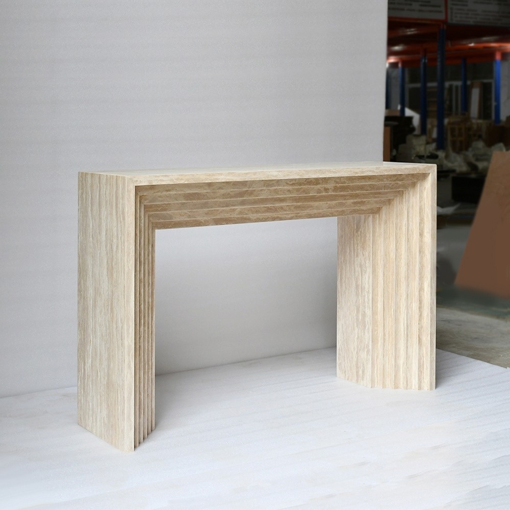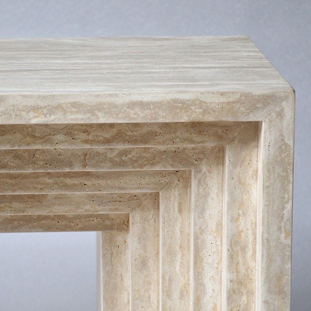 A característica que define a mesa é sua marcante estrutura escalonada e em camadas: uma série de recortes retangulares embutidos percorrem a parte inferior do tampo e descem pelas pernas verticais, criando uma silhueta arquitetônica tridimensional e rítmica. Bordas verticais caneladas nas pernas externas amplificam a profundidade da textura, transformando um suporte funcional em uma obra de arte escultural que brinca com luz e sombra.